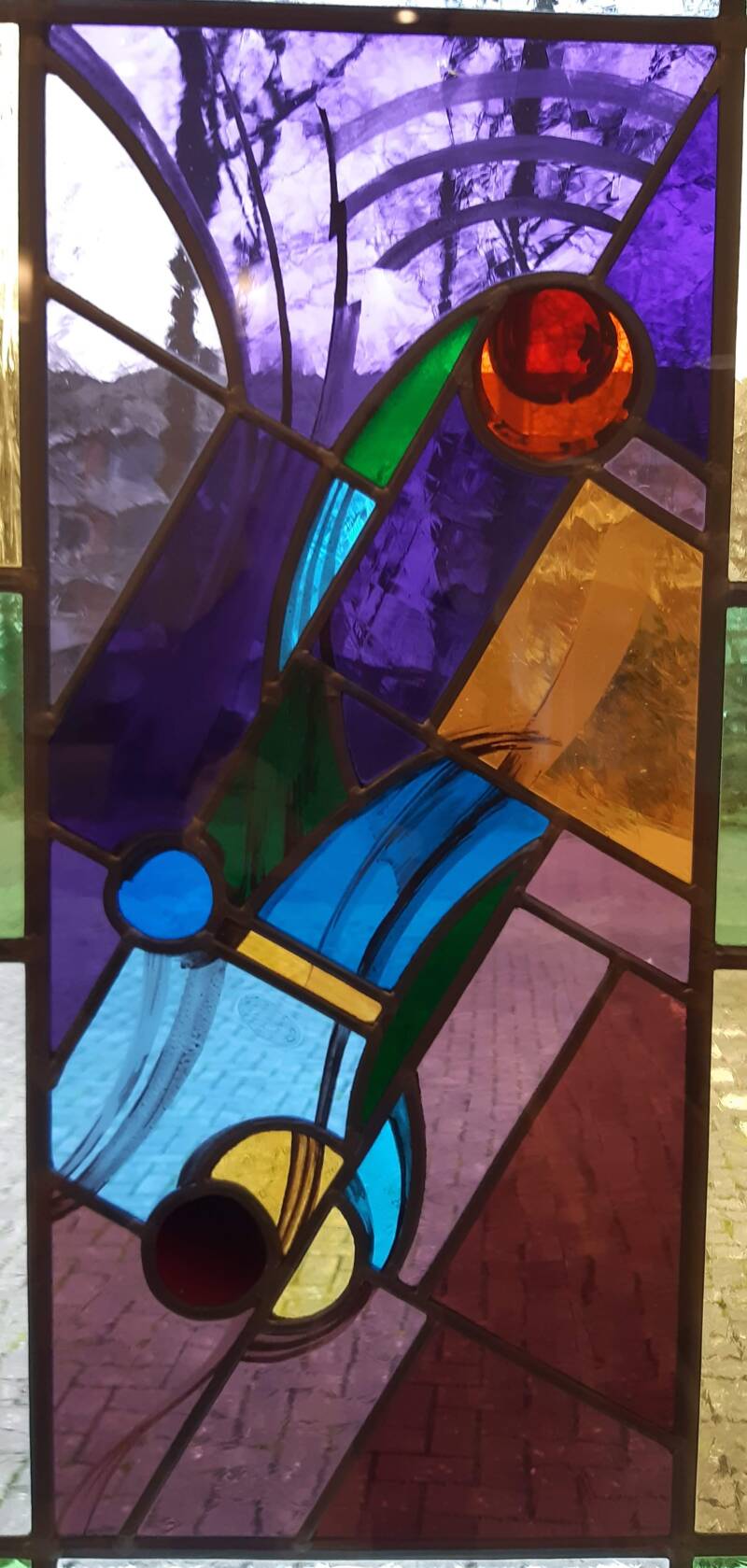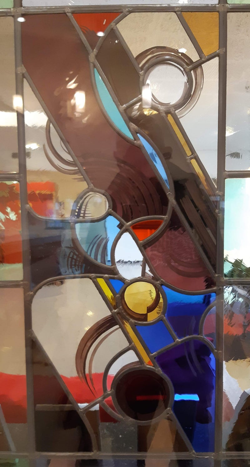 details uit de zijramen met geabstraheerde liturgische symbolen