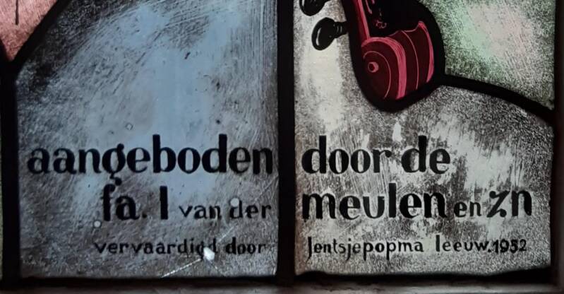 afb. midden boven: In een raam aan de achterzijde van het pand (maar nu binnen, door een latere aanbouw) is een gebrandschilderd raam te vinden met de heraldische wapens van de families Crack, Dekema, Van Cuijck en Foeyt. Ook dit raam dateert van de vroege jaren 50 van de vorige eeuw, al doet de figuratie vermoeden dat het veel ouder is.