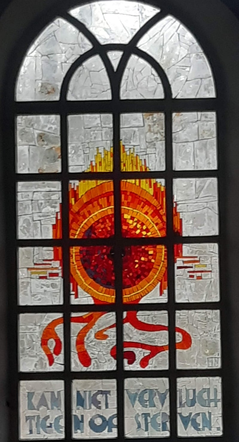 De 15e eeuwse kapel van Nieuweschoot is de laatste 50 jaar in gebruik als rouwcentrum bij de begraafplaats Schoterhof. In 1976 heeft Hans Niemeijer (1921-1990) hier in 10 ramen taferelen gemaakt in de glas-appliqué techniek. Acht grote ramen vertellen het verhaal, de twee kleine, ronde zijn puur decoratief. De figuraties zijn afgestemd op het gebruik van de kapel als uitvaart-centrum. Hij koos in zijn ontwerp voor niet-religieuze symboliek omdat de Schoterhof een algemene begraafplaats is. In de figuraties zijn de vier elementen verwerkt: water, vuur, lucht, aarde. De ontwerpen dicht bij de ingang zijn nog zeer doorzichtig: het daglicht komt vrijwel ongehinderd binnen. Gaandeweg verder in de kapel is de glasappliqué kleurrijker en het hele raam bedekkend. De vliegende ganzen verbeelden de zielen der overledenen. Waarom ganzen? De omgeving van Nieuweschoot ligt onder de trekroute van de ganzen. De aangrenzende weilanden zijn tijdens de trek rust- en fourageergebied.