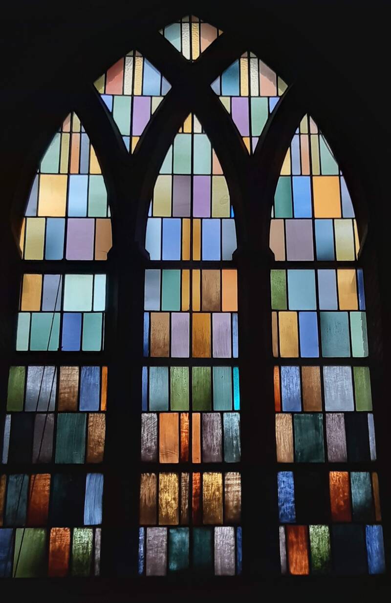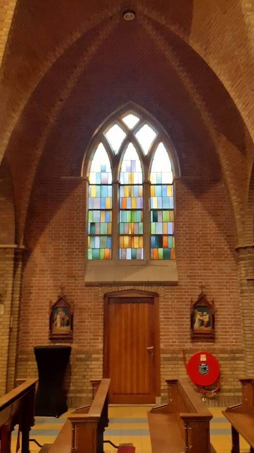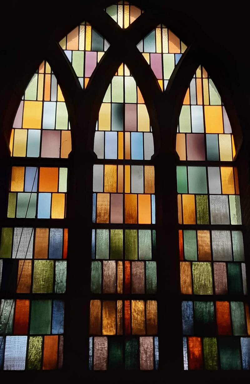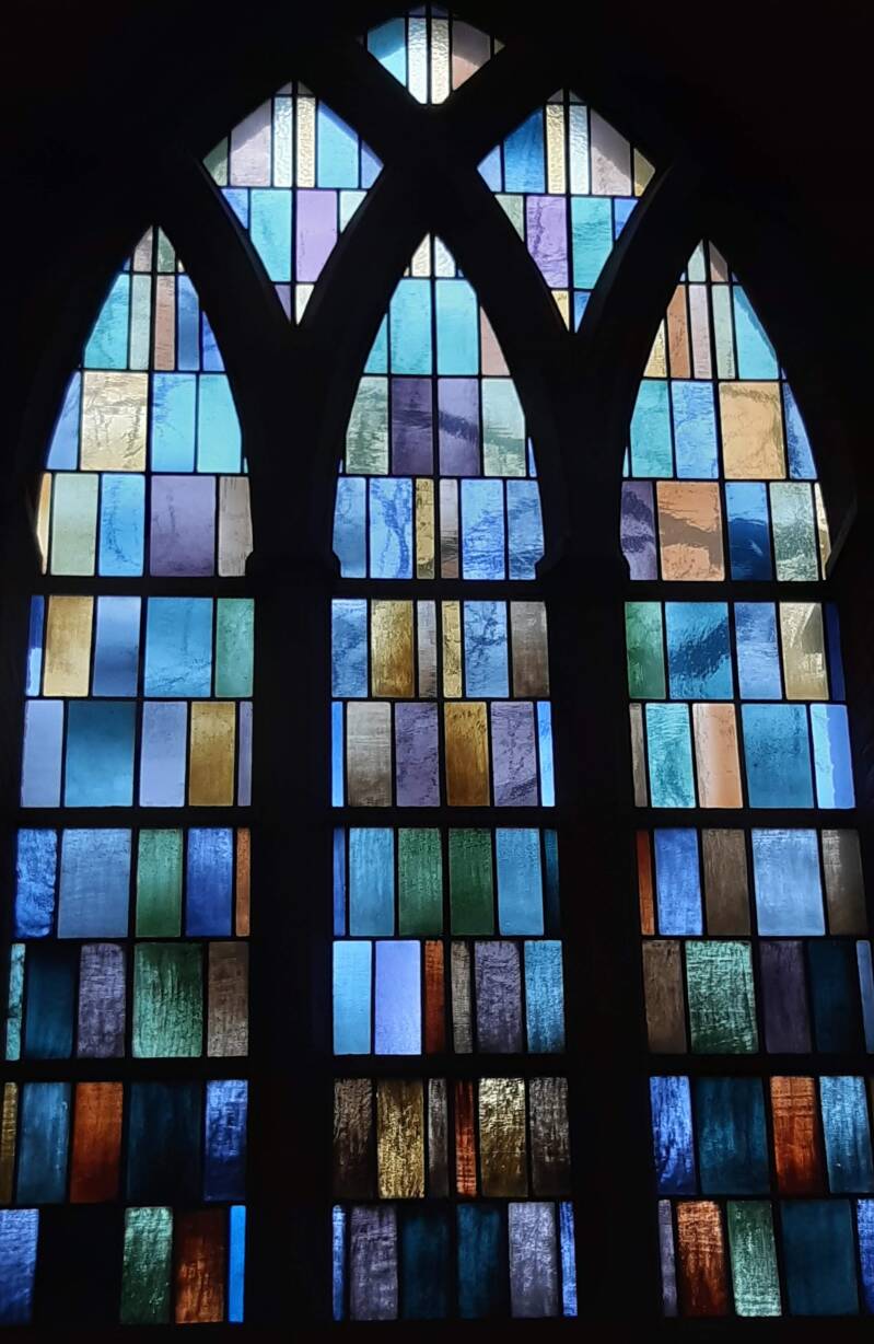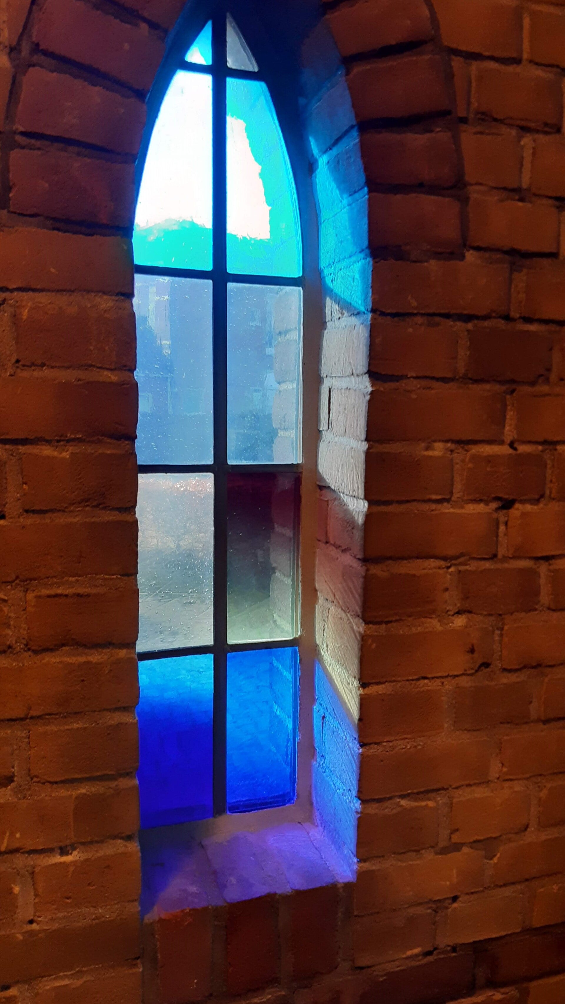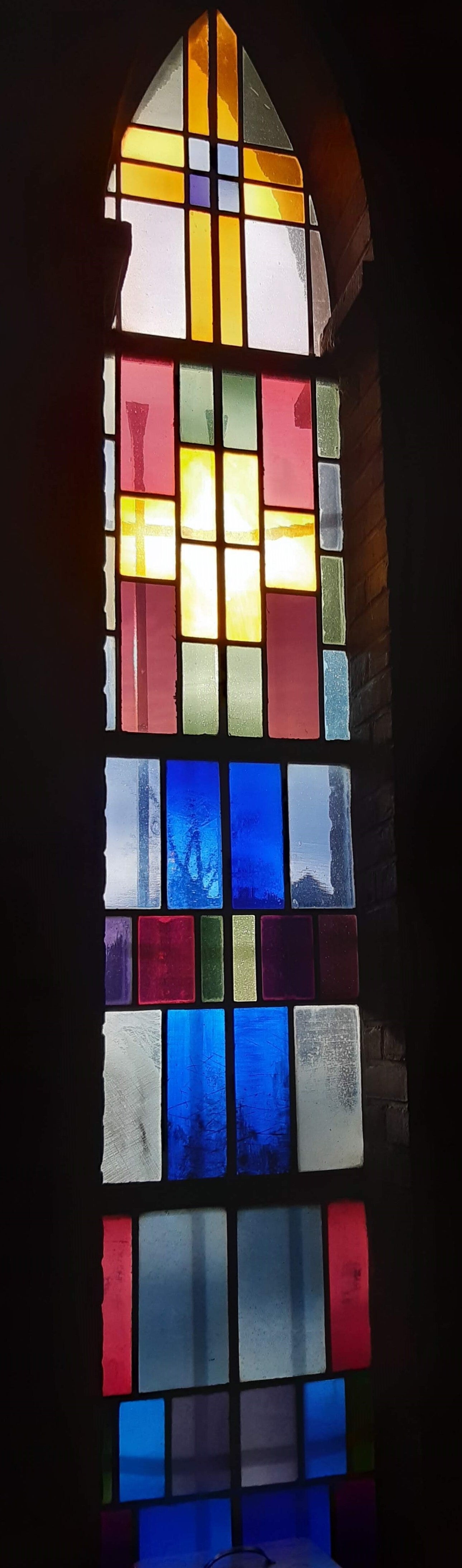 Er is fraai gekleurd, mondgeblazen kathedraalglas verwerkt.
