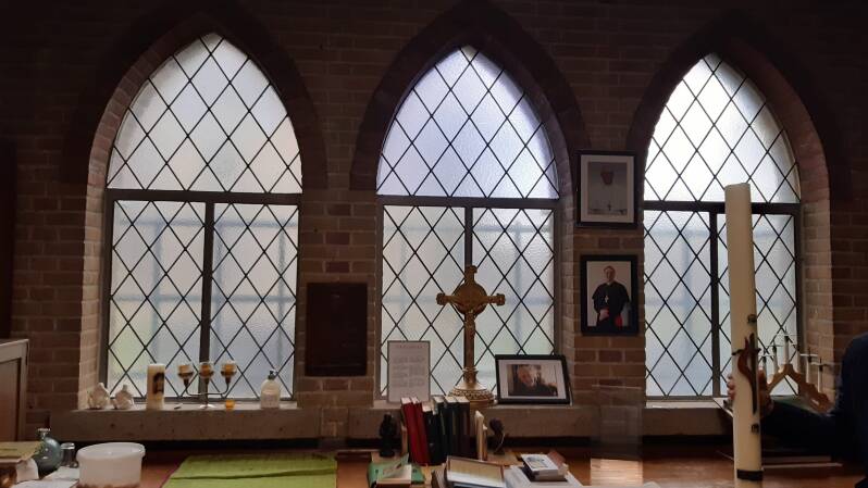 De ramen in het schip met onderaan donkere tinten door bewerking met glasgrisaille, naar boven toe steeds lichter wordend.
