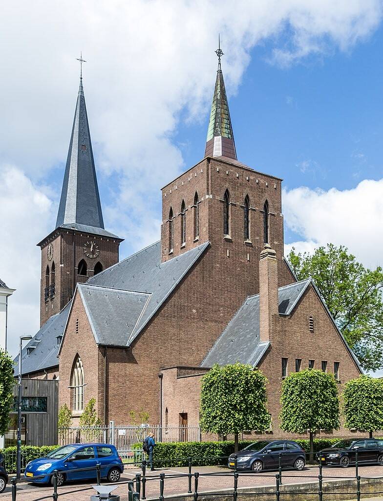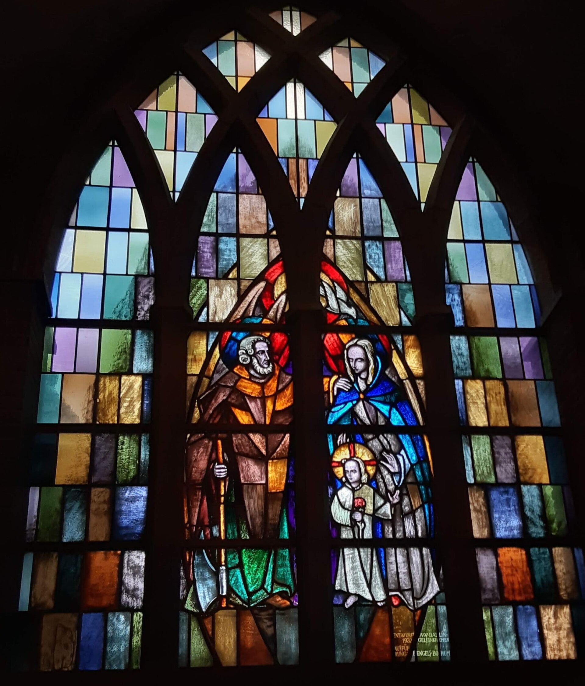 De Rooms-Katholieke Heilige Geest-Kerk (1933, architekt H.C.M. van Beers) is voorzien van, naar Roomse begrippen, sober uitgevoerd gekleurd glas. Binnen blijft hierdoor de nadruk liggen op het gecompliceerde lijnenspel van het neogotische metselwerk. Er is met fraaie secundaire kleuren gewerkt die in elk raam onderaan vrij donker zijn door opgebrachte grisaille, maar naar boven toe steeds lichter worden. Er zijn slechts twee ramen met taferelen, nl. de Annunciatie en de H. Familie, haast 'weggestopt' in de zuidelijke en noordelijke zijbeuk. Bovenin bezitten deze twee ramen een kruismotief. Heel opmerkelijk heeft het kindeke Jezus twee linkerhanden (vergroot het kindeke hierboven door op zijn hand te klikken). Heeft de ontwerper daar een bedoeling mee, of is het een foutje van de uitvoerder? De ontwerper is A.W. Ballin, de uitvoering is gedaan door Atelier E. Engels te Bochum. Aan de westzijde is een bescheiden roosvenster met abstract glas in lood aangebracht (afb. rechtsboven). De sacristie en de Mariakapel zijn eveneens voorzien van glas in lood. De sacristie doet het bescheiden aan met een kleurloos drieluik, de Mariakapel daarentegen heeft kleurrijke ramen met de Ichtus, de H. Drieëenheid en een uitbeelding van Psalm 42: de 'moede hinde, smachtend naar het klare water'.