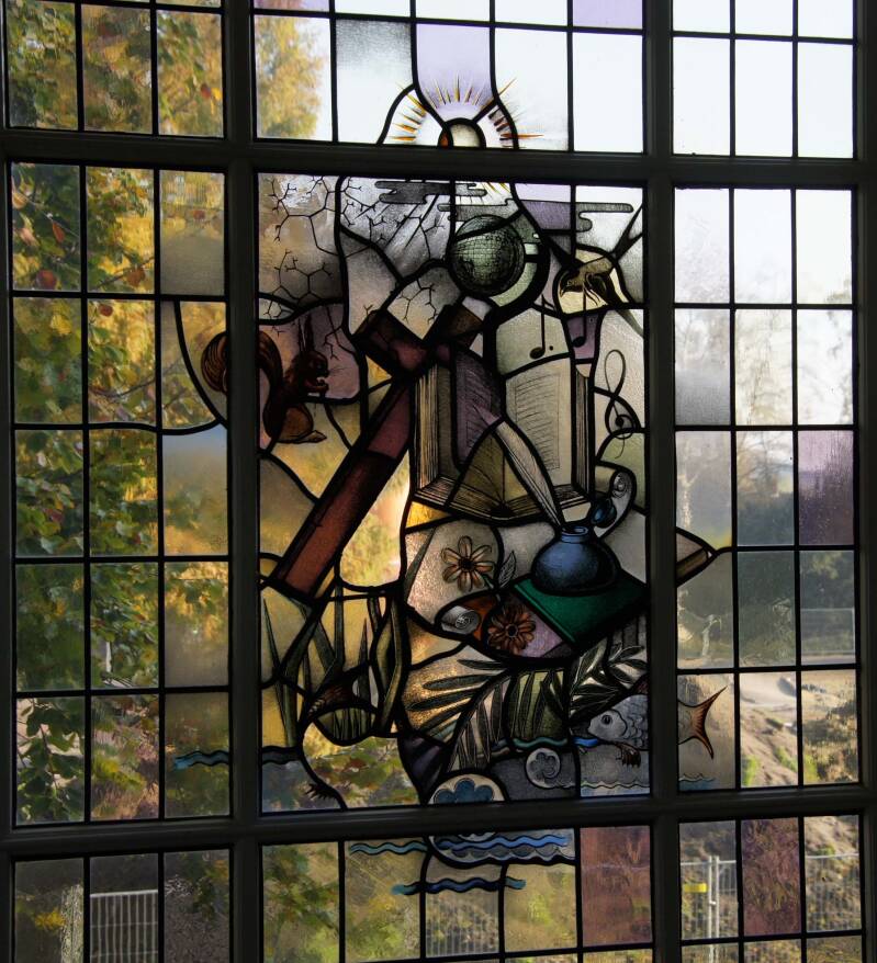 Helaas niet te zien want in depot van het Heerenveens Museum is het raam van de voormalige Petra-basisschool. Ook dit raam is ontworpen door Frits Klein. Het bevat in figuratie het hele scala aan leerstof van een bassischool. Prominent weergegeven: het kruis, symbool voor een school van christelijke signatuur. Frits Klein zal er geen moeite mee hebben gehad, hij was een godvruchtig man. Techniek van dit kunstwerk is brandschildering op glas in lood, uitgevoerd door de Fa. Hoving te Groningen.