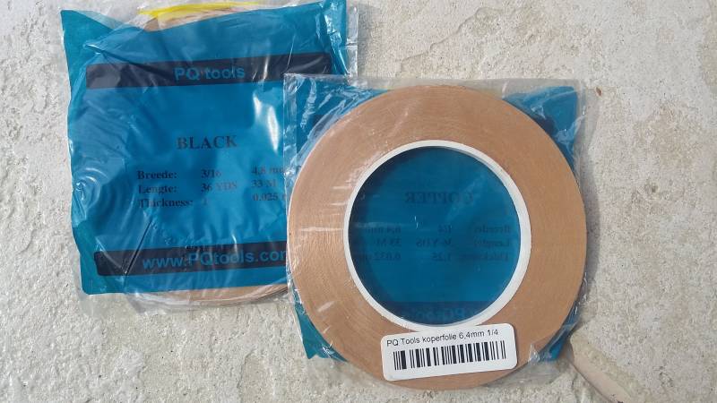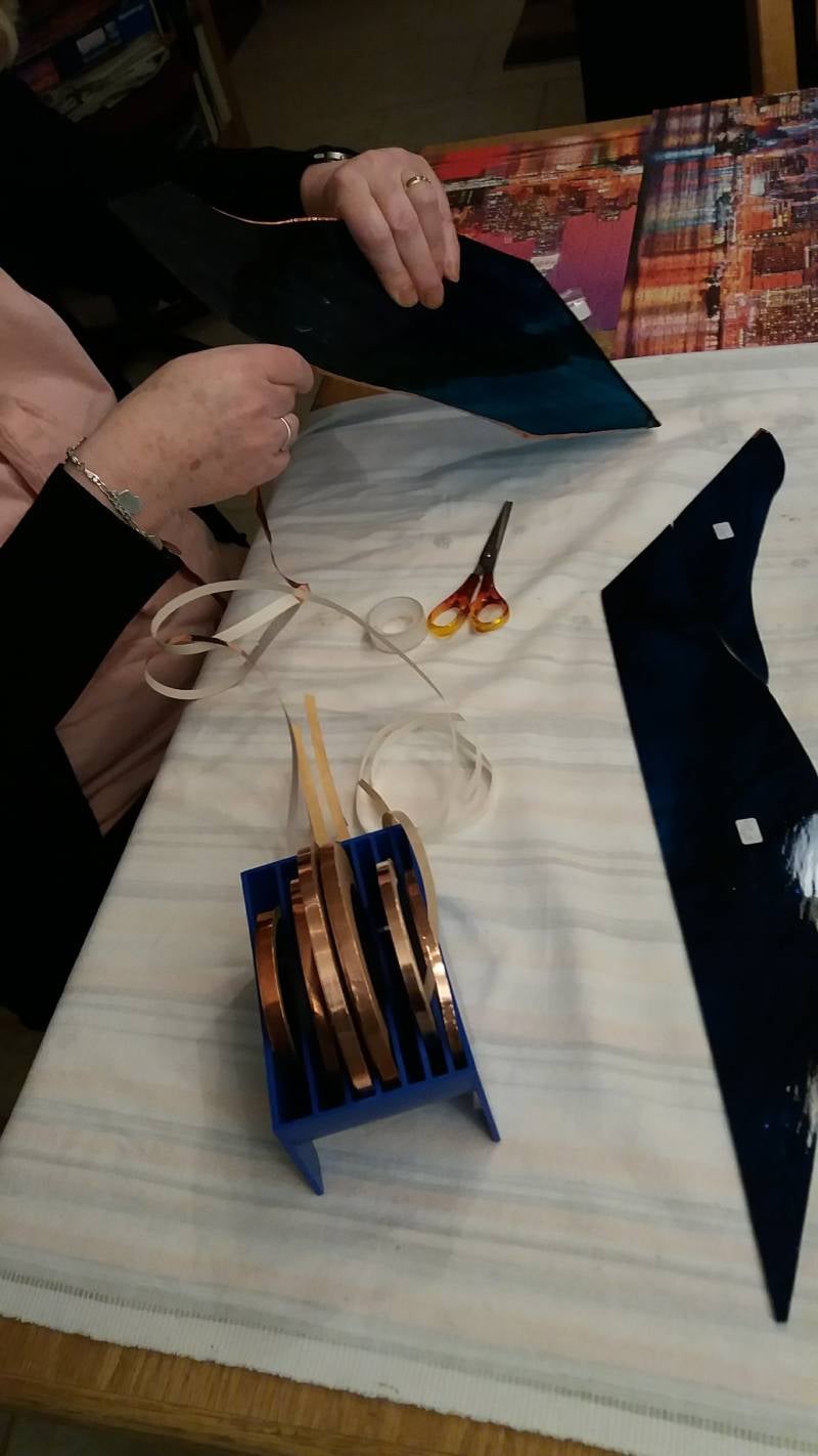 Elk der 300 delen moet voorzien worden van een randje koperfolie, de ondergrond waarop straks de tinlijnen gesoldeerd worden. Het materiaal is er op verschillende breedtes waardoor de breedte van de tinlijnen beïnvloedbaar is. Grote glasdelen krijgen in het algemeen breder folie dan kleine. Het glas is volgens specificatie 3 mm dik, maar de realiteit is een variërende dikte tussen 2,5 en 3,5 mm, aangezien het hier een mondgeblazen soort betreft. Dat heeft bij gelijke foliebreedte direct gevolg voor de dikte van de tinlijn. Lastig, want je wil geen variatie in lijnbreedte als gevolg van wisselende glasdikte. Die variatie wil je helemaal zelf bepalen: verschil in lijnbreedte maakt het tafereel natuurlijker en het suggereert dieptewerking.