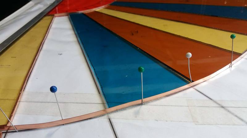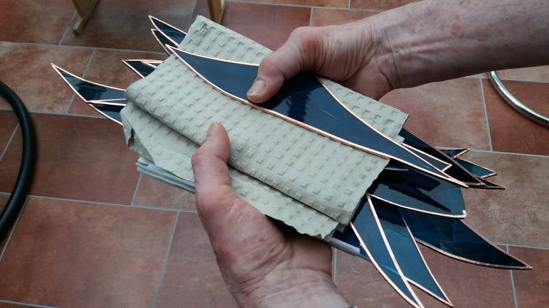 Er worden langs sommige lijnen flexibele koperstrips van 3 mm breed mee gesoldeerd. Deze strips worden verticaal tussen de glasdelen geplaatst, zie foto's hieronder. Ze moeten de druk absorberen die onwillekeurig op het glas uitgeoefend wordt bij de bewerkingen. Voor het advies dank aan Samantha Schofield Calder van Living Sun Glass (Canada)