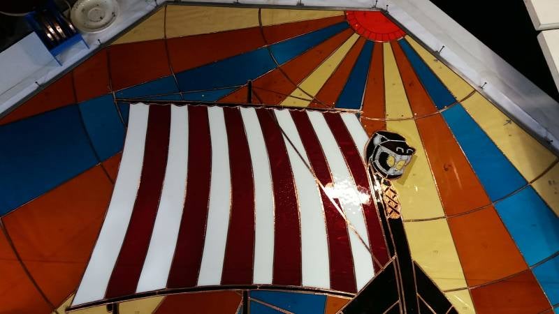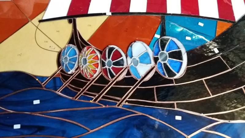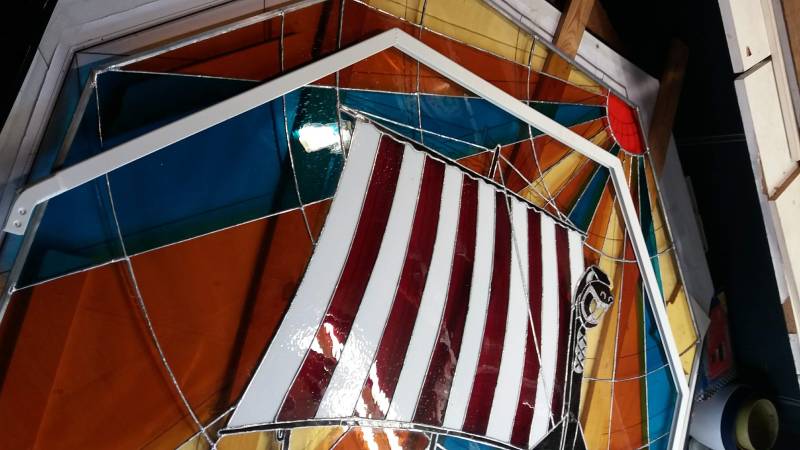 Verbazing resteert over het onbewogen blijven van het glas ondanks de blootstelling aan zulke hoge temperaturen. Een zucht van verlichting ontsnapt aan GlassJohs als al die kwetsbare stroken van het rood-witte zeil na het solderen ongeschonden zijn. Maar ja... dit was pas de eerste zijde.