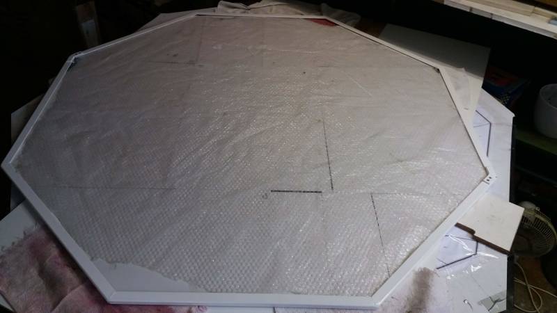 Als het frame eromheen zit, gaan we het raam keren. Normaal gesproken is dit het 'Magisch Moment' omdat een raam in deze fase voor 't eerst rechtop staat, en het licht erdoor komt. Je ziet eindelijk waar je voor gewerkt hebt! Weinig magie deze keer, het raam zit tussen planken, en uitstekende delen zijn bedekt met folie.