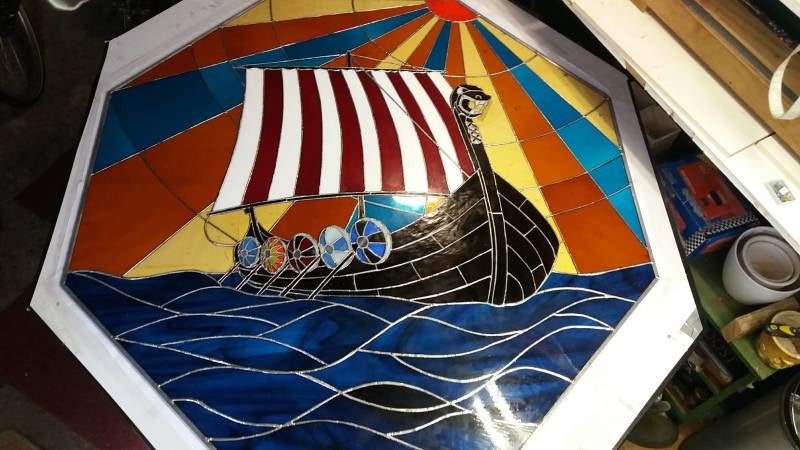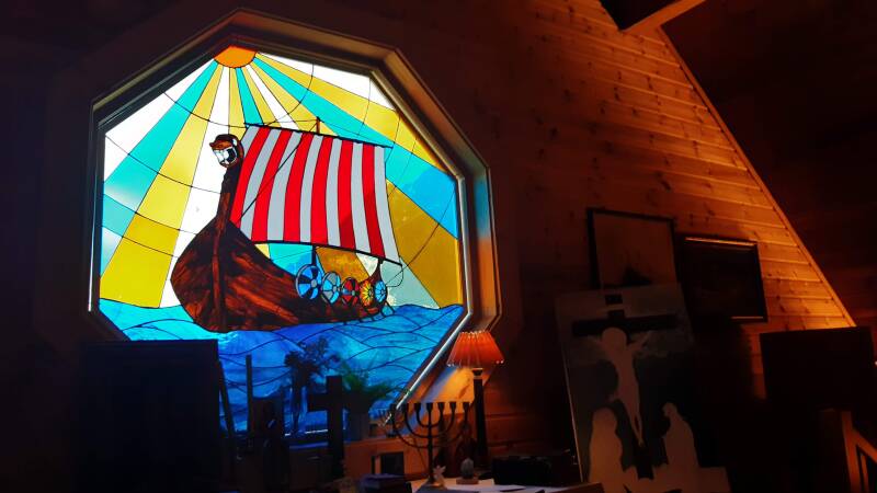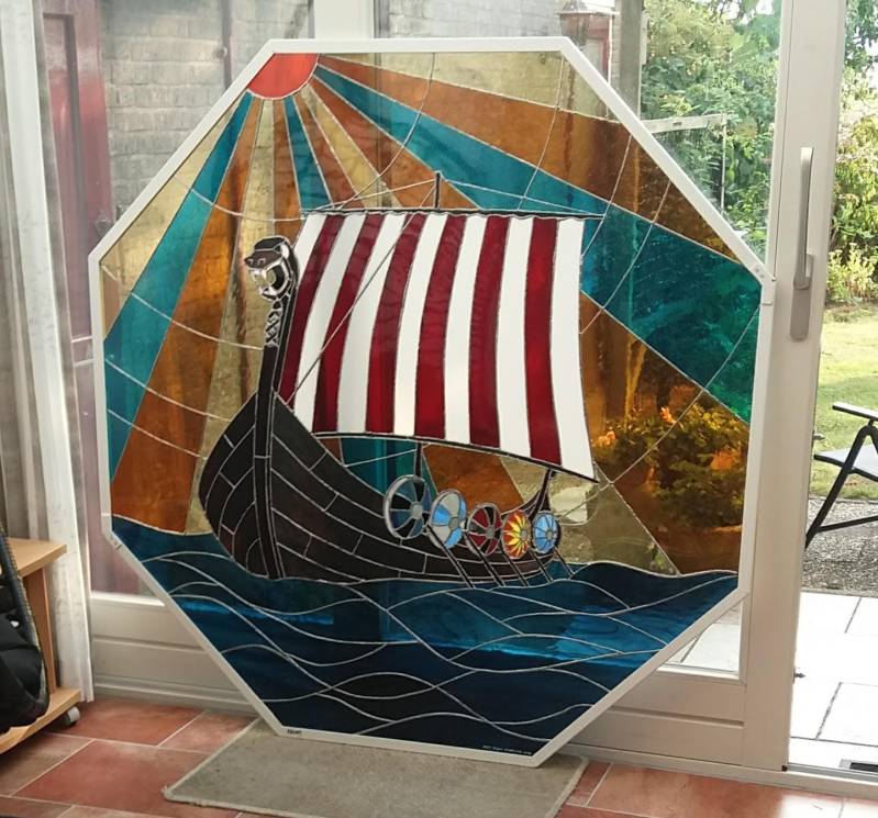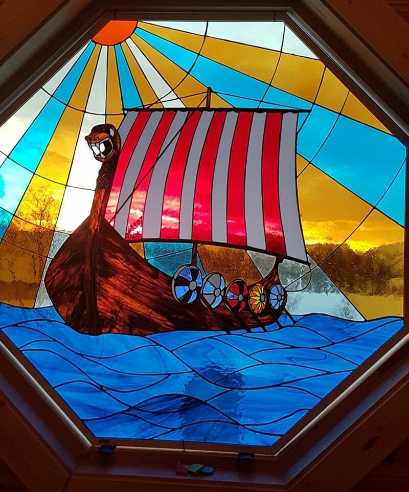 Het raam gaat op reis naar de buurtschap Lyngen, gemeente Lyngseidet, Noorwegen. De route via Zweden is 2800 km. Op de foto middenonder een voorproefje van het resultaat. In de Vikingcabin van opdrachtgever Haakon Karlsen, waar zijn jonge onderzoekers van MIT FabLab Norway bijeenkomen, is tijdelijk een kleurenprint in het raam geplakt. Rechtsonder het moment van plaatsing. Helemaal onderaan het raam in vol ornaat in 'The Great Hall'. Het was mij een genoegen de glazen versie te mogen maken. Dank Rudie van der Meer voor de bemiddeling. Dank Haakon Karlsen Jr. voor het vertrouwen bij het verlenen van deze opdracht.