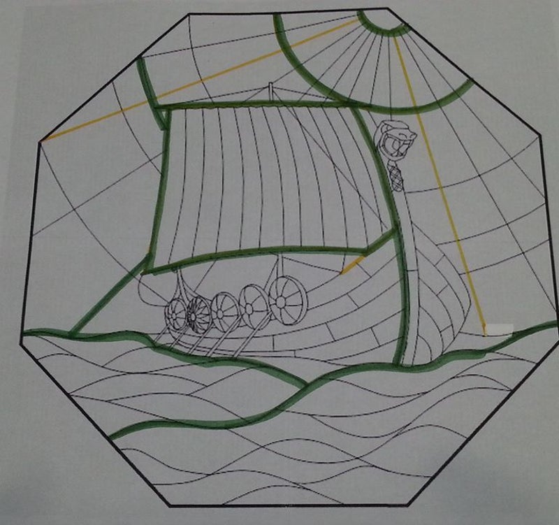 Het ontwerp vraagt qua lijndiktes een zorgvuldige benadering. De breedte varieert nogal binnen het ontwerp. Tussen de golven mag de lijn wat robuuster zijn, een contrast met de tinlijnen in het zeil. De schilden zijn samengesteld uit kleine glasdelen, daar horen nog dunnere tinlijnen bij. Iets bredere lijnen vooraan tegen dunnere achterin, suggereren diepte. Bij het folie-wikkelen wordt daar al rekening mee gehouden; hoe breder de folie, hoe dikker straks de tinlijn. Met het scalpelmesje worden vóór het solderen de laatste correcties aangebracht. Het gaat er altijd om dat de lijndikte niet 'toevallig' ontstaat, maar dat er gebeurt wat je voorziet. Dat gaat best ver, want het is lastig daar in de ontwerptekening al rekening mee te houden. Variabele foliebreedtes en scalpel zijn hier dus de bijkomende hulpmiddelen.