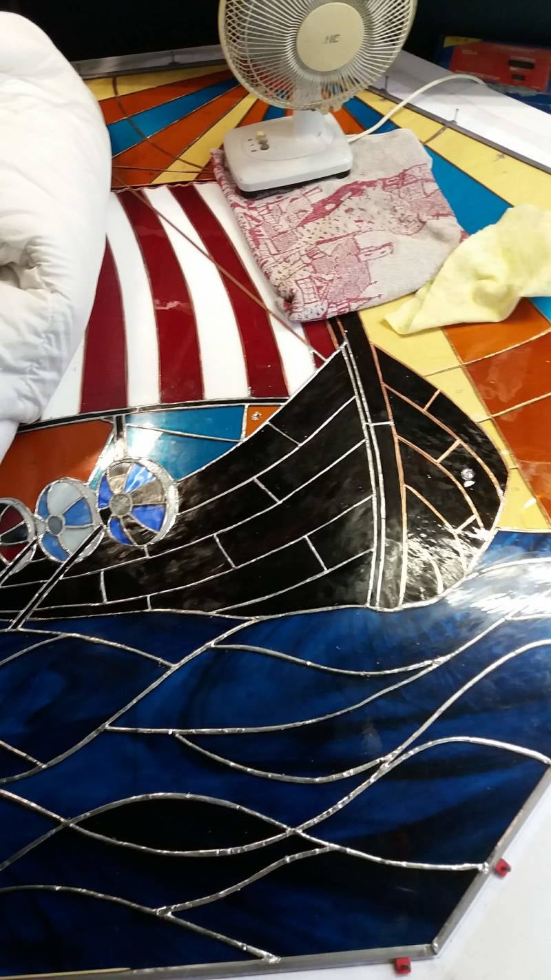 Bij dit formaat is het keren een delicate klus. De glasdelen bewegen nog enigszins ten opzichte van elkaar, omdat maar één zijde gesoldeerd is. Lange lijnen in het ontwerp kunnen gaan 'scharnieren'. In horizontale stand dreigt door het eigen gewicht voortdurend breuk. Het raam moet gesteund worden, boven en onder worden planken erlangs geklemd. Het totaalgewicht zal gauw 40 kilo zijn. Met drie mensen lukt de keer-klus. Nu ligt de echte voorkant boven. Alle folielijnen worden nagelopen en aangepast waar nodig. Het bruine glas van de kiel heeft een zeer gestructureerde bovenkant, lastig om de folie in de kiertjes te laten hechten. Bij het solderen blijkt ook wel hoe moeilijk het is om de lijnen strak te krijgen op het bobbelige bruine glas. Alweer een uitdaging. Deze tweede kant is nu ook klaar. Voor beide zijden is in totaal ruim 2 kilo soldeertin gebruikt.