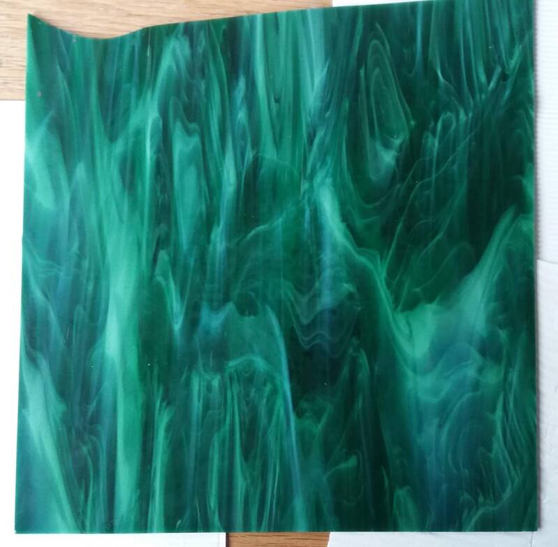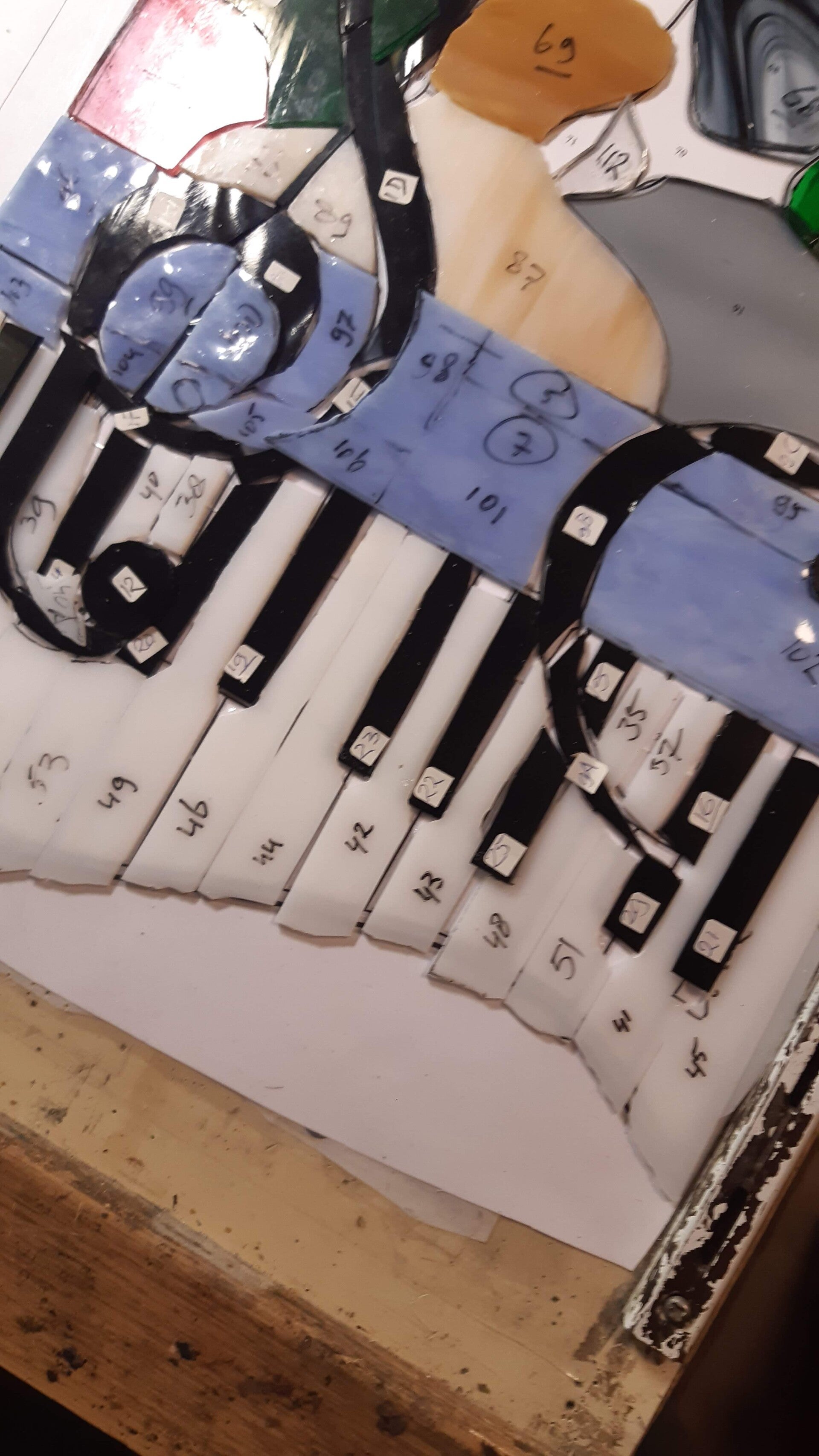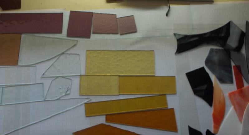 Het blijft altijd spannend hoe het effect zal zijn als straks alle glasdelen samengevoegd zijn. Door ervaring valt veel te voorspellen. Grijs, groen, aubergine... geen makkelijke wens. Het is een mooi proces om het geheel zo dicht mogelijk bij het ontwerp te componeren.