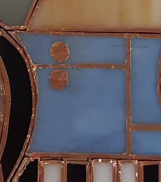 Onder het randlood is een stalen strip aangebracht. Die strip loopt met de omgekeerde U-vorm mee tot onderaan beide zijkanten. De ophang-ogen worden aan deze strip gesoldeerd, zodat het gewicht straks aan het 'skelet' hangt, niet aan het zachte lood. Vervolgens wordt de rand aan alle zijden afgedekt met een U-profiel van 8 mm. Alle bewerkingen veroorzaakten één maal een barstje, met een hulptinlijn is deze gemaskeerd.