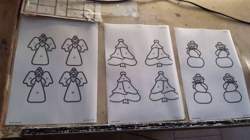 Het snijden gaat snel: 5 delen per boompje, 4 per sneeuwman. Volgens tekening bevat de sneeuwman 7 delen, maar de neus wordt gesmokkeld, en de armen worden opgeplakt, het middendeel is dus 1 stuk, zie de foto van het slijpwerk.