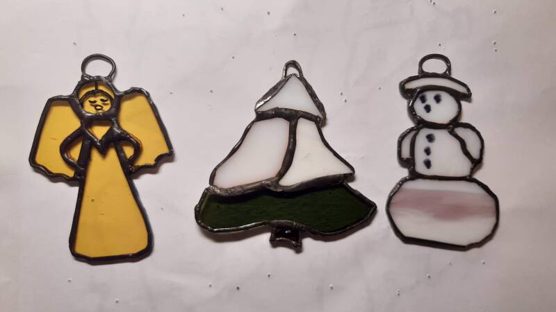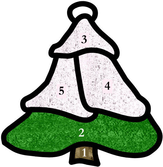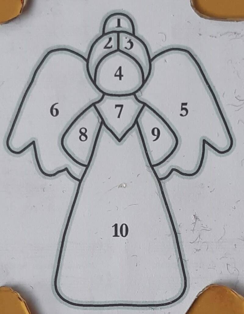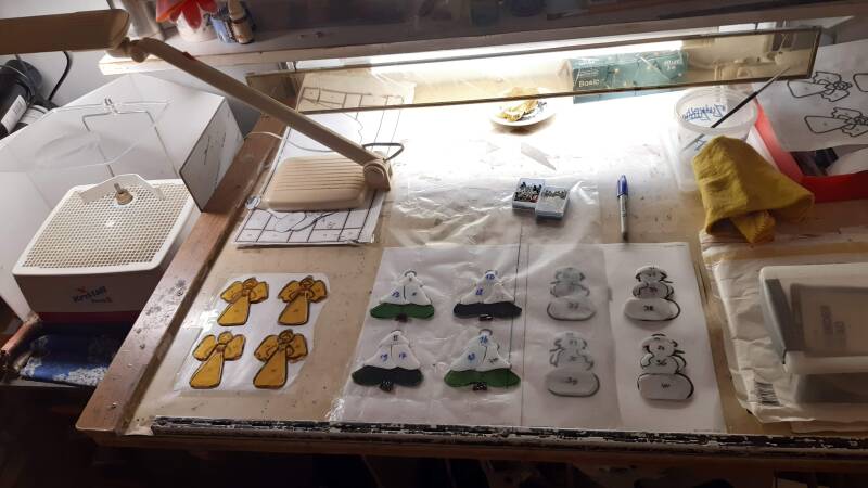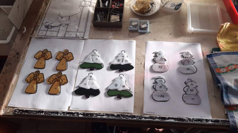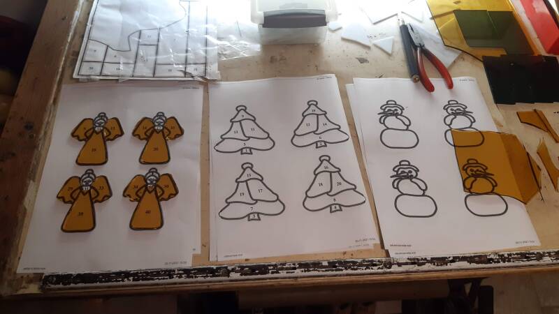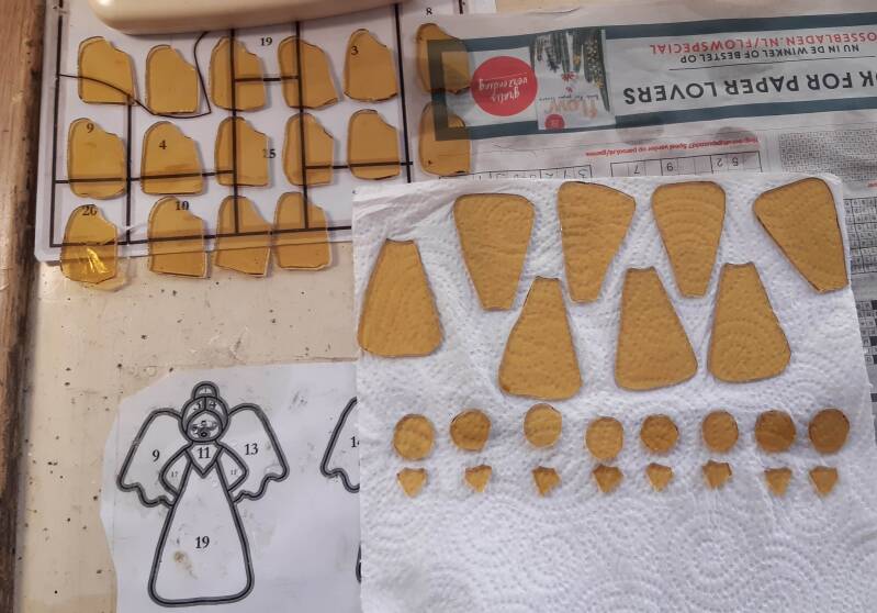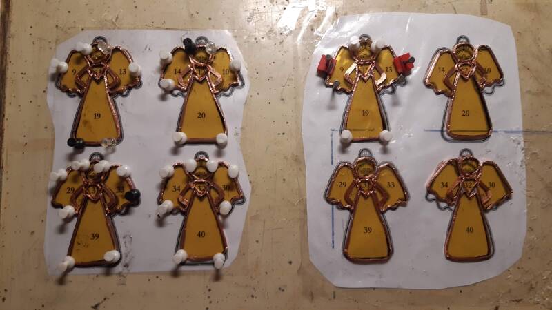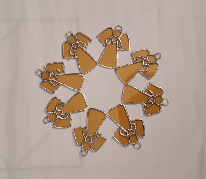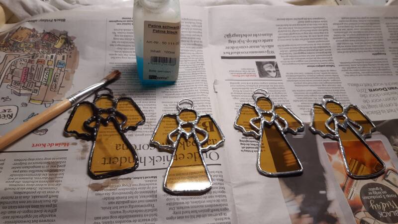 De engelen tellen 5, geen 7 glasdelen. De armpjes worden over de vleugel geplakt. Tinsoldeer doet ze tevoorschijn komen.