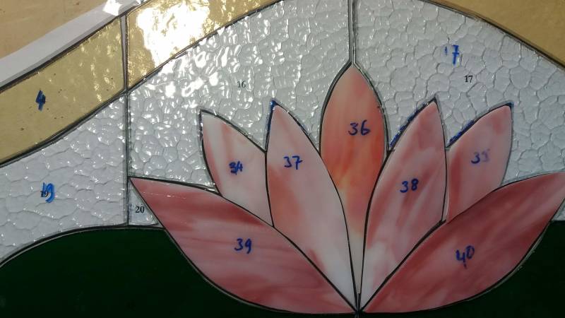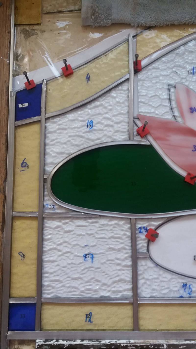 Glasdeel voor glasdeel wordt in 't lood gezet. De groene bladeren zijn lastig te zetten, evenals de uitgeslepen delen boven de lotus. In de vier zijden wordt inleg-ijzer gebruikt. Het ijzer voor de bovenkant wordt voorgebogen volgens werktekening om spanning te vermijden. Het ontstane frame van ijzer geeft de gewenste stijfheid aan het raam. Hulpblokjes met nagels houden het raam nog op zijn plaats, alle delen liggen immers nog los.