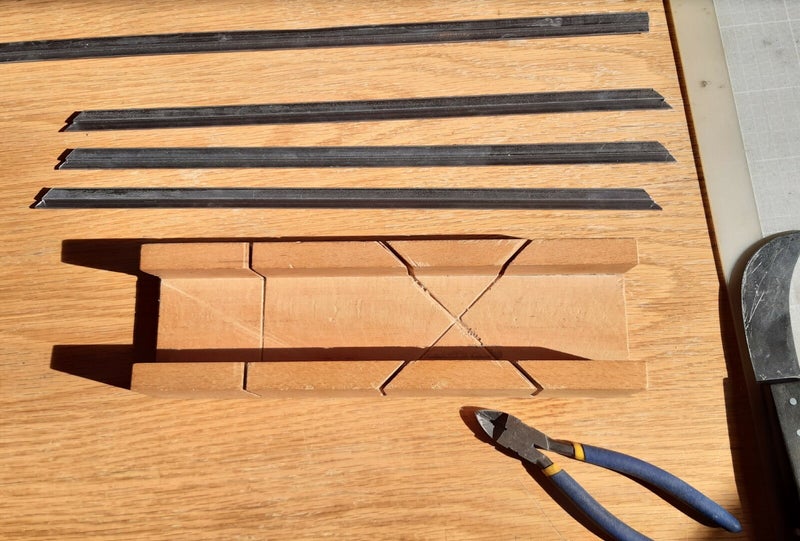 We komen toe aan het loodzetten. De ramen worden in thermopane gezet, dus voor de randen wordt Y-lood gebruikt. De hoeken worden in verstek gesneden. Het binnenwerk wordt uitgevoerd met H-lood 6mm.