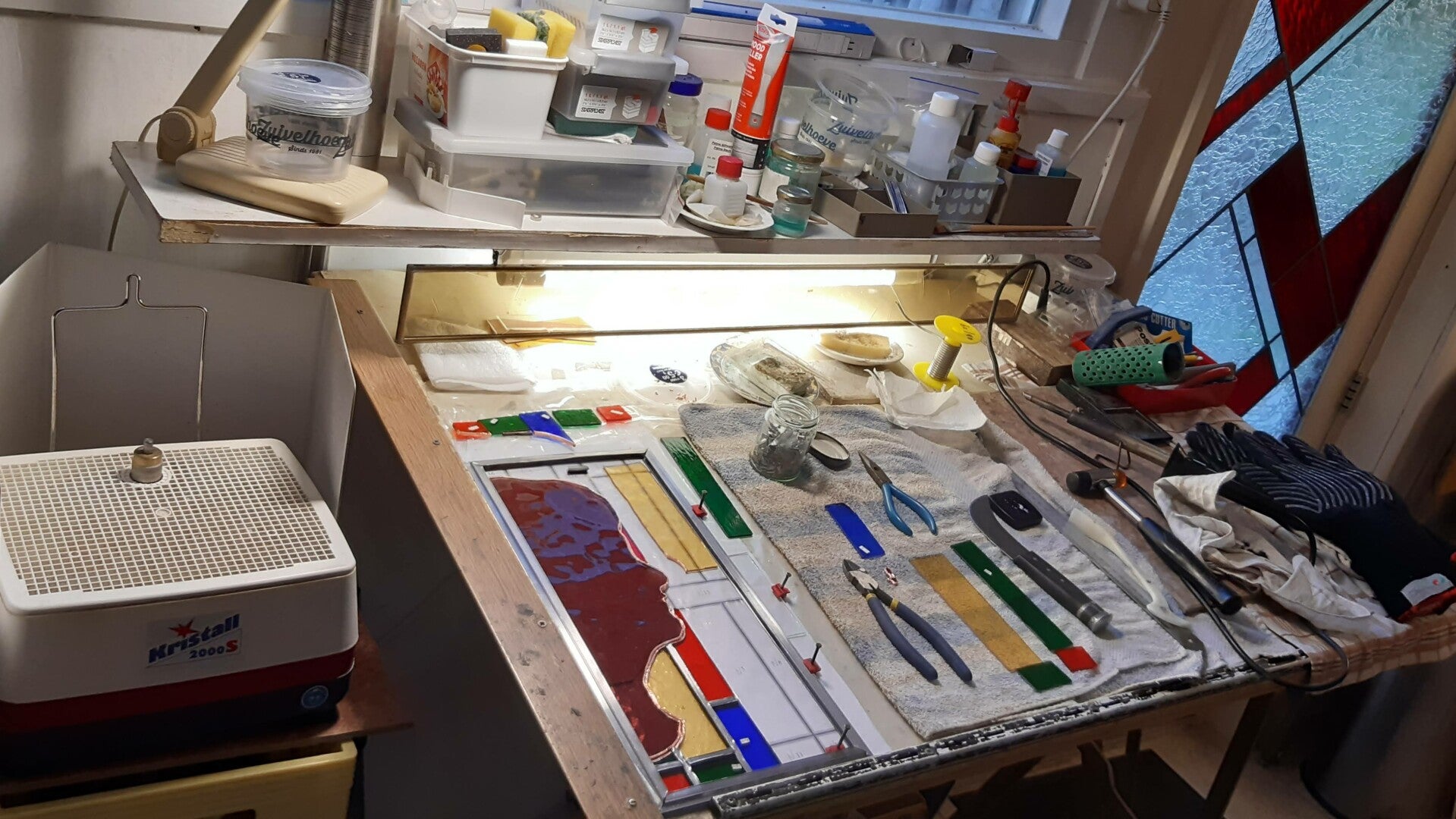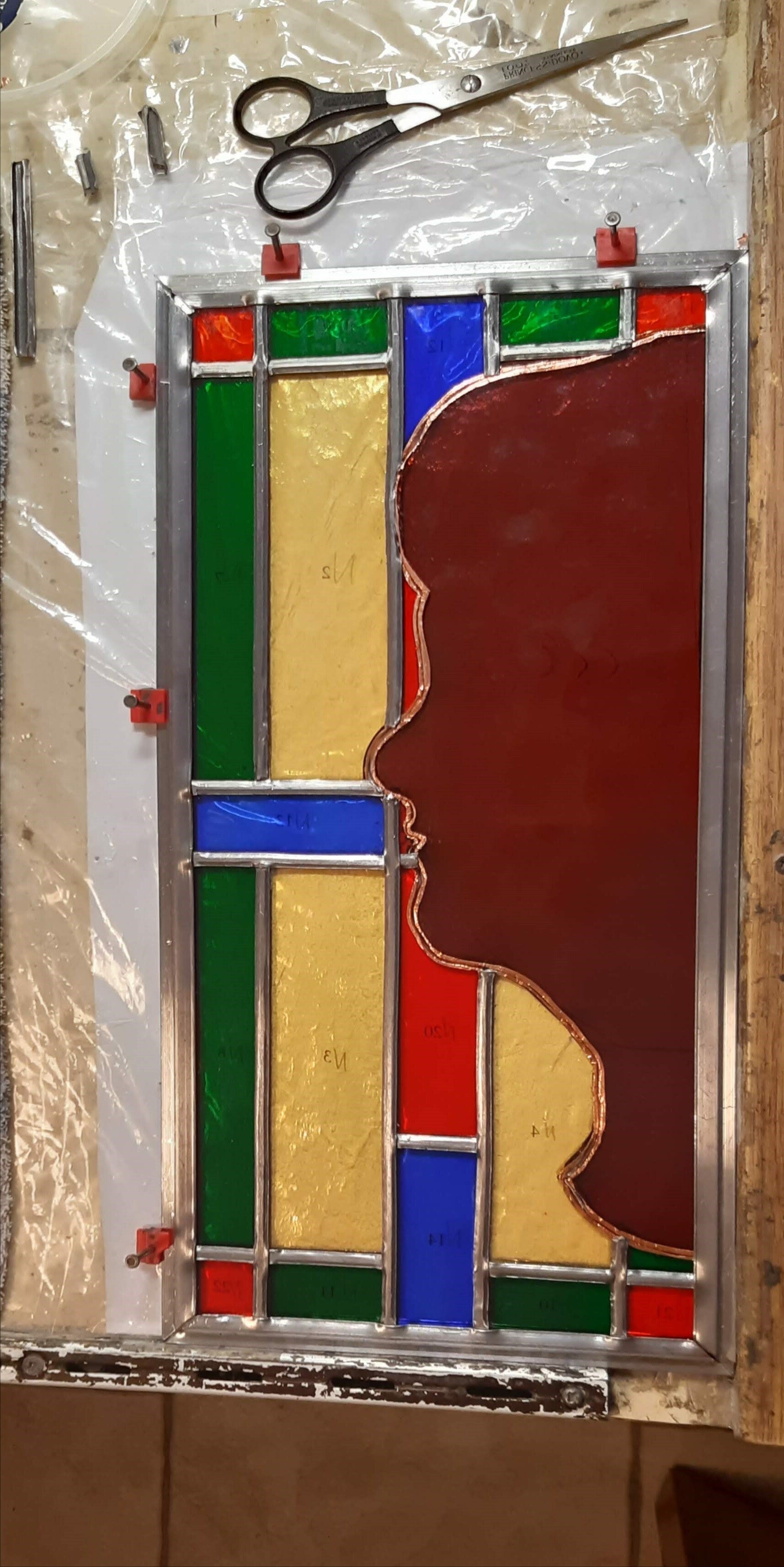De 'hoofd' zaak is klaar. Dit gedeelte wordt in tiffany uitgevoerd. Profielen en de aansluitende glasdelen worden voorzien van koperfolie.